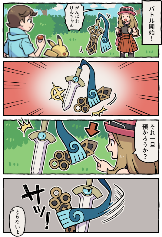 ヒトツキ、ハイパーお気に入りポケモン。普段は鞘に収まってて、バトルの時だけ脱いで自分のお手手で持っててカワイイ。最終進化系のギルガルドもフォルムチェンジと専用技があって凝ってる! カロス地方のナンバーワン決定!!!㊗(でも専用技《キングシールド》を覚えるためには技思い出させオバチャンにハートのウロコを持って行かないといけないの、何)
